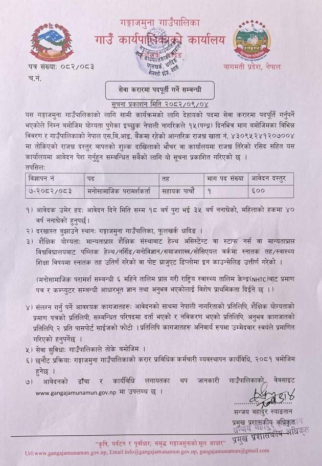 करार सेवामा पदपुर्तिको लागि दरखास्त आव्हान (मनोसामाजिक परामर्शकर्ता)