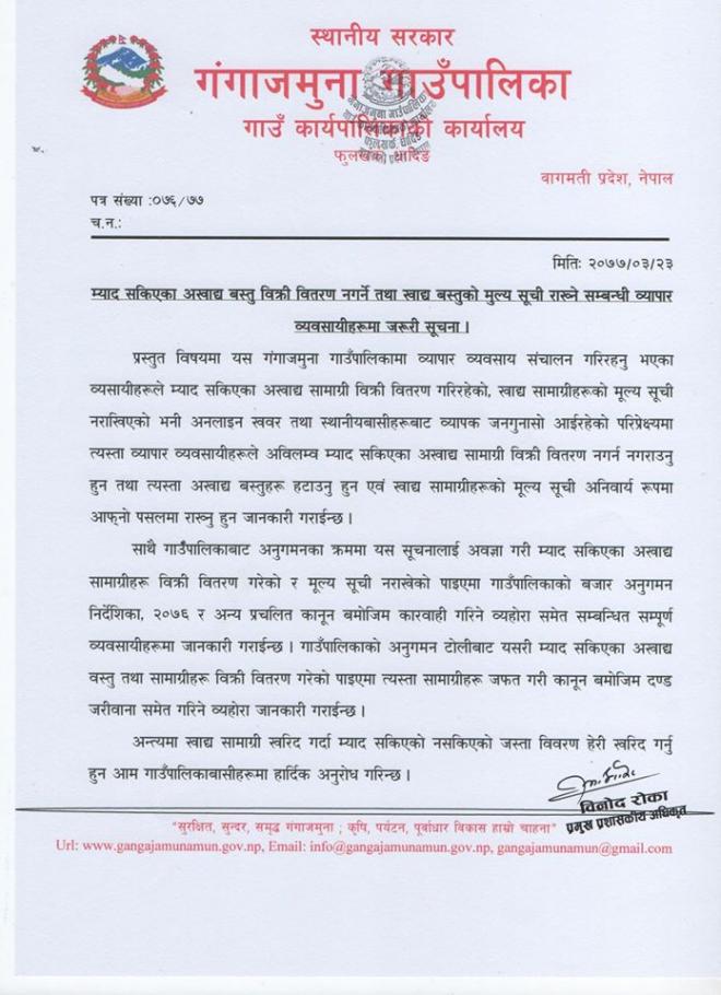 म्याद सकिएका अखाद्य बस्तु बिक्रि वितरण नगर्ने तथा खाद्य बस्तुको मूल्य सुची राख्ने सम्बन्धी ब्यापार व्यवसायीहरुमा जरुरी सूचना ||