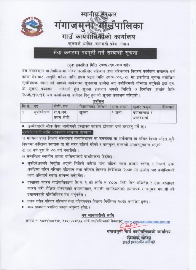 सेवा करारमा पदपुर्ती गर्ने सम्बन्धी सुचना । (सुपरिवेक्षक)