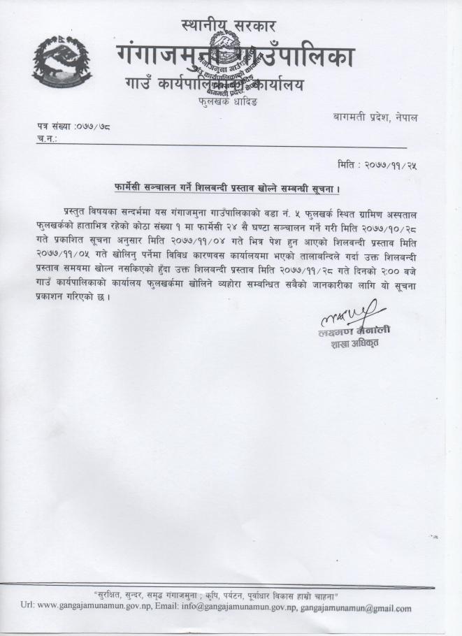 फार्मेसी संचालन गर्ने शिलबन्दी प्रस्ताव खाेल्ने सम्बन्धी सूचना